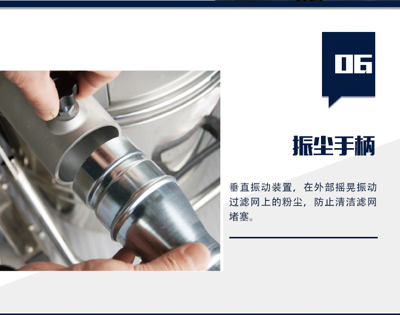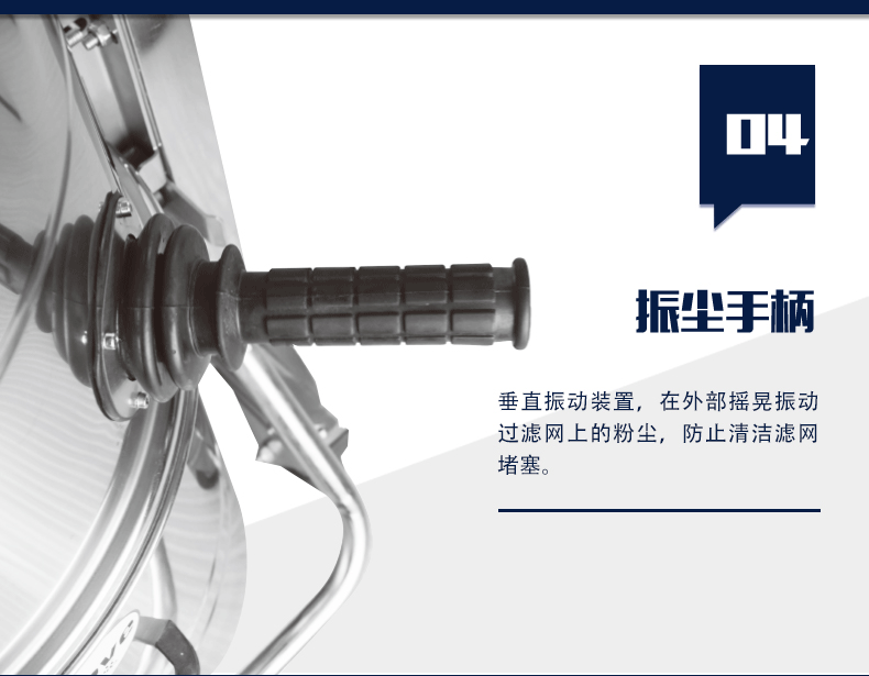 4. 過濾裝置 :聚酯涂層星型過濾器有效防止灰 塵堵塞,配加手動(dòng)震塵,外部搖晃即可完成內(nèi)部濾網(wǎng)的清理,方便快捷。