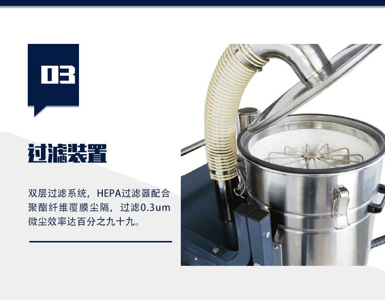 3. 吸塵電機(jī) : CE認(rèn)證的鋁鑄工藝免維護(hù)無刷高壓風(fēng)機(jī)可不停機(jī)工作。出風(fēng)配加消音管,工作環(huán)境更安靜舒適。
